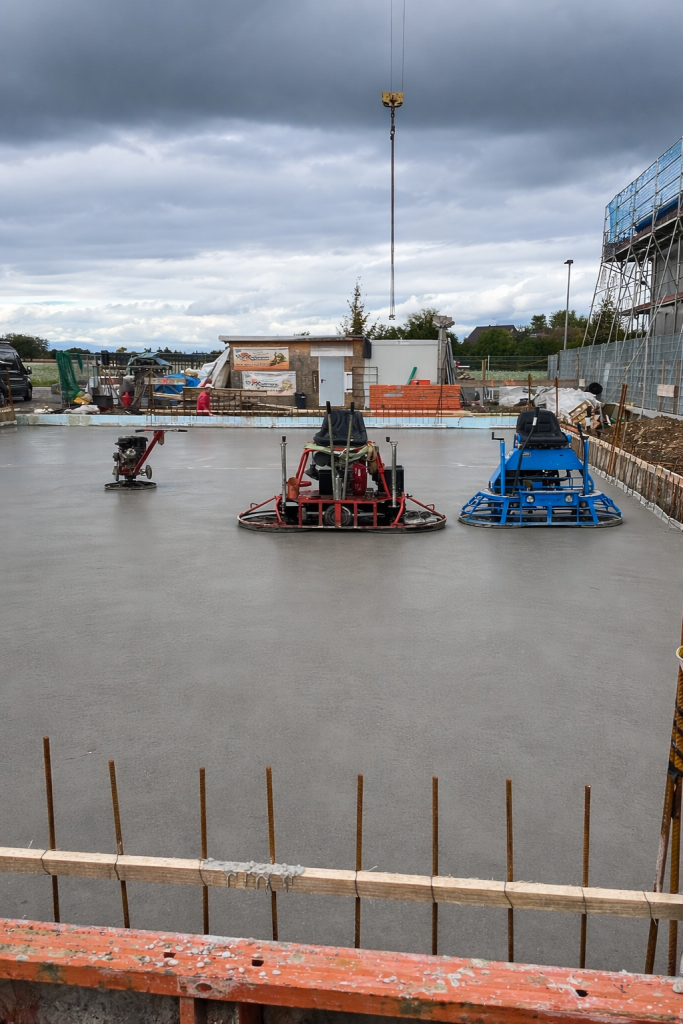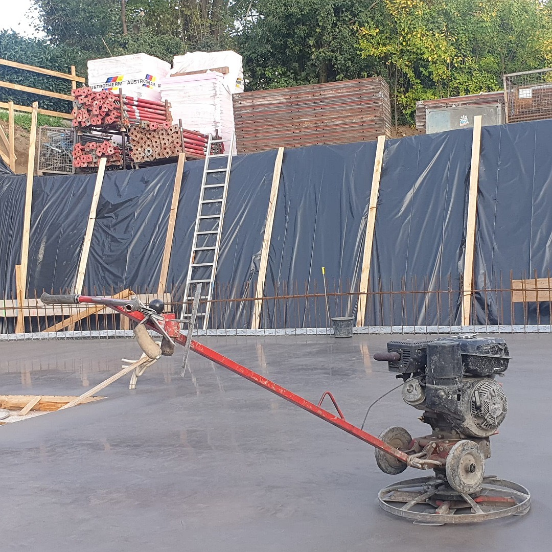 Die frisch betonierte Bodenplatte wird mit einer geglätteten